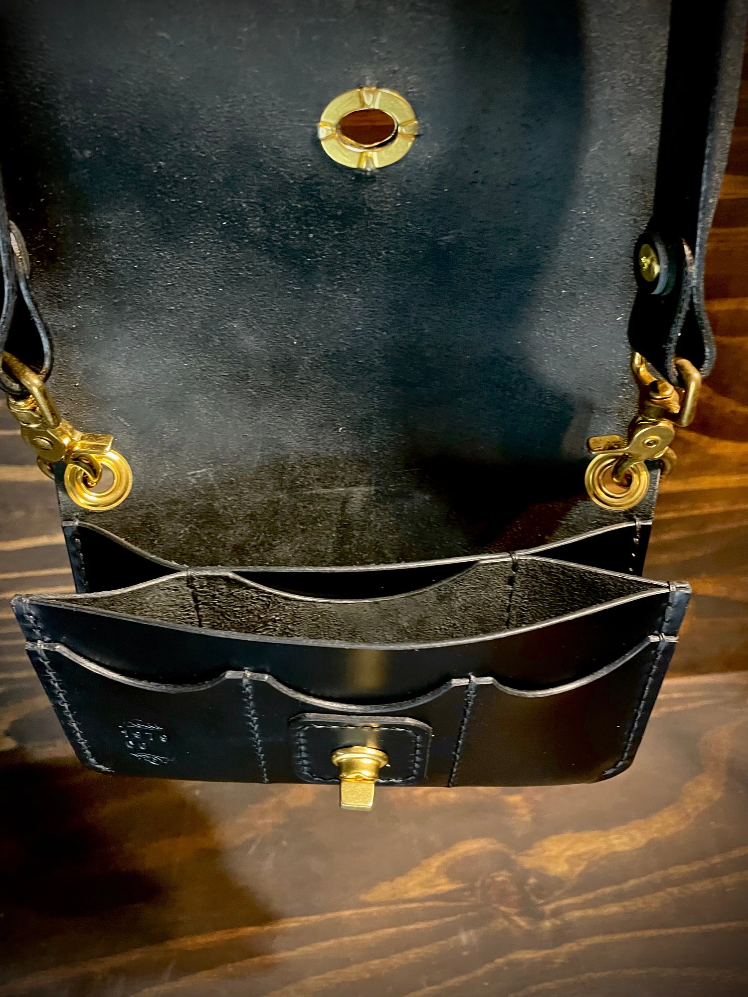 • Solid brass hardware all around, turn lock closure for fast access while keeping things secure